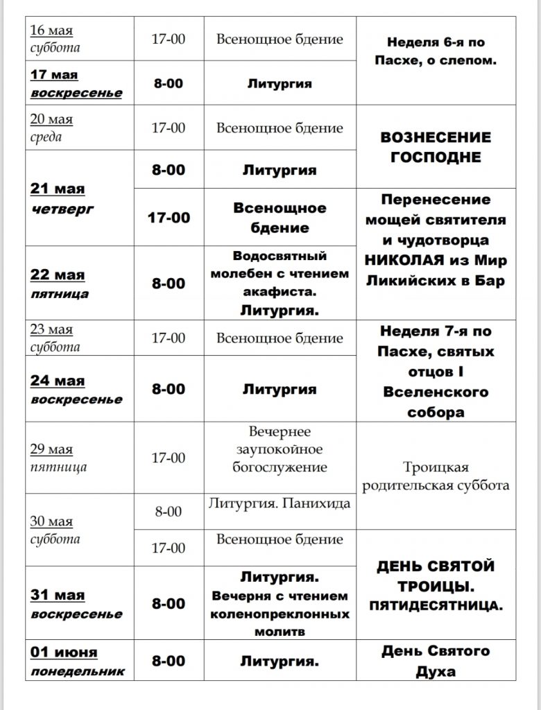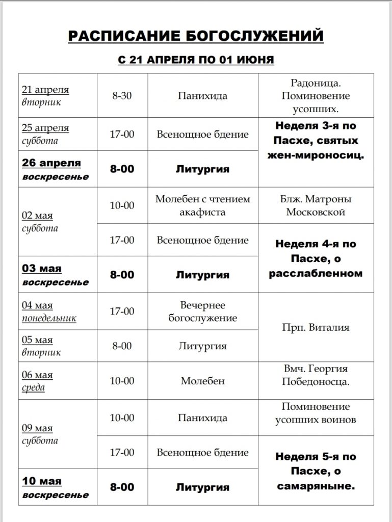 РАСПИСАНИЕ БОГОСЛУЖЕНИЙ С 21 АПРЕЛЯ ПО 01 ИЮНЯ 2026