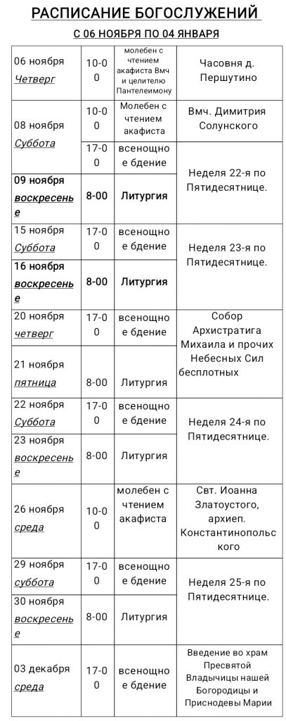 РАСПИСАНИЕ БОГОСЛУЖЕНИЙ с 6 ноября 2025 по 4 января 2026